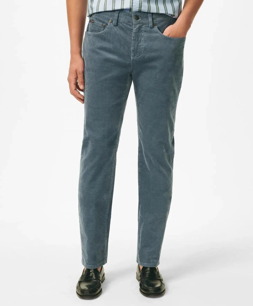 Classic 5-pocket styling. Cotton corduroy with stretch for comfort. Contrast waistband and pocketing. Leather patch at wearer's back right waistband.